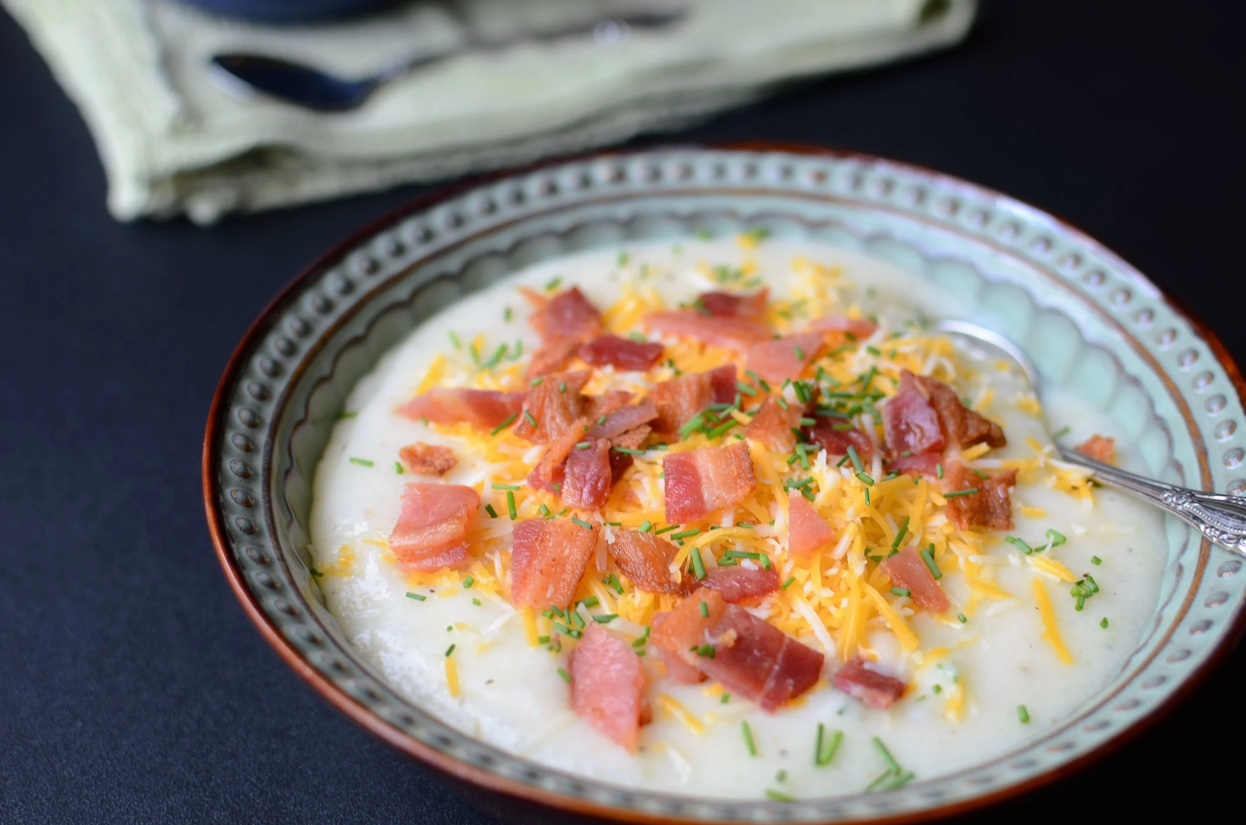 garnish: chopped chives, shredded cheddar, cooked bacon, etc