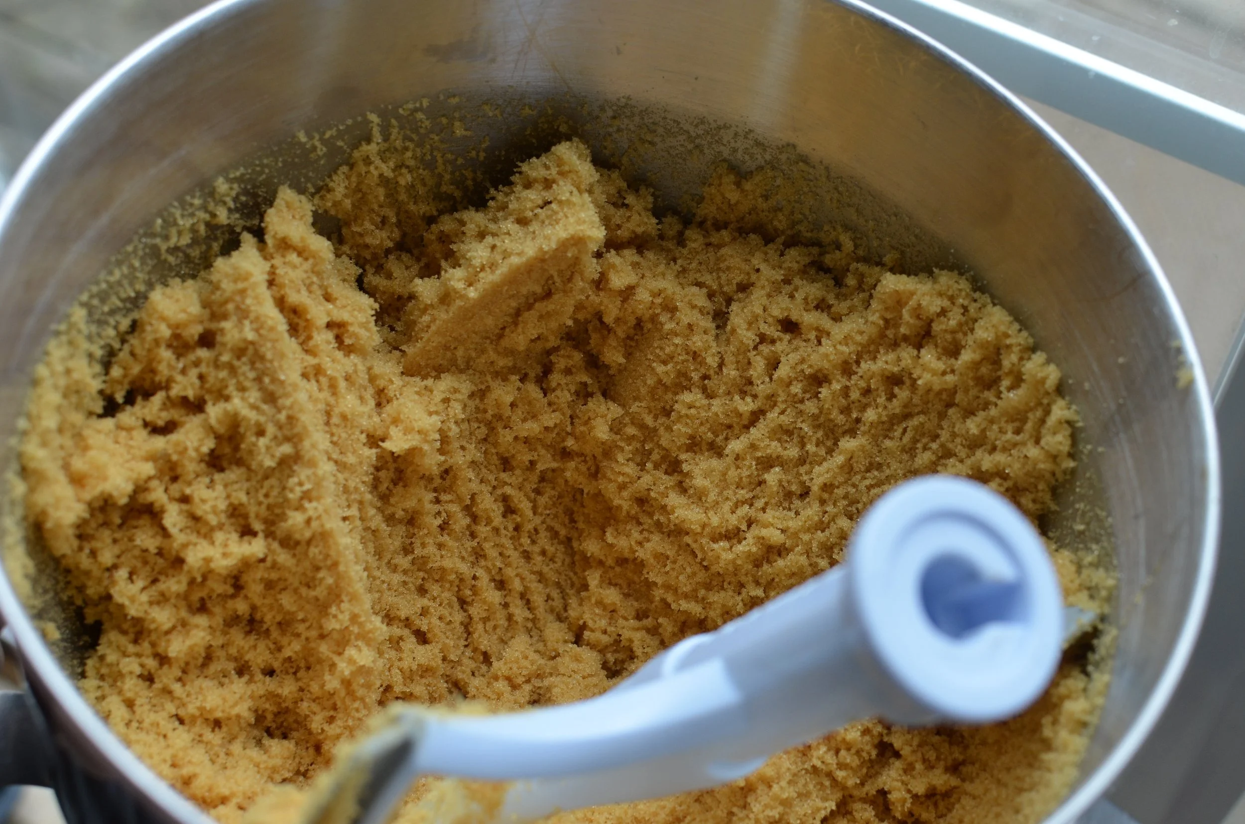 Using the ingredient amounts listed below, place molasses and granulated sugar in the bowl of a stand mixer fitted with the paddle attachment and mix for 5 minutes, stopping once to to scrape the paddle and bowl.