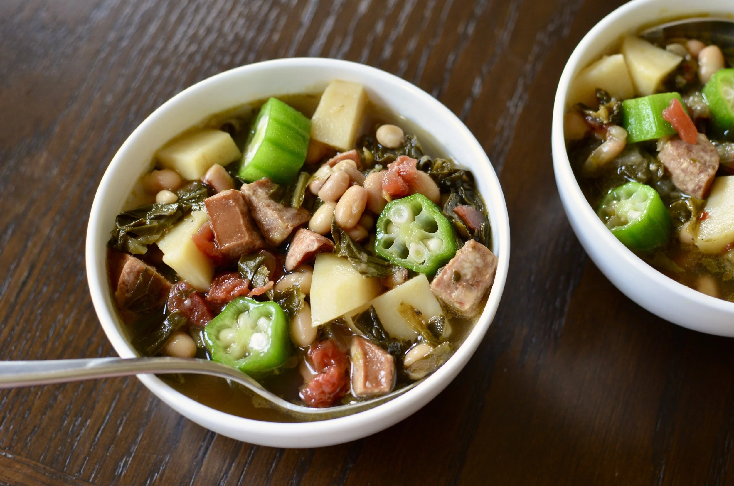 Here in the south, you can purchase frozen okra at the grocery store, but you can also freeze them yourself during the summer months when you find them at the farmer’s market. Purchase whole okra that are no more than 4 or 5 inches in length. Wash, trim, and cut them into coins; then freeze in a single layer on a parchment-lined sheet pan (no need to blanch first). Transfer the frozen coins to vacuum sealed bags and stash them away in your freezer for use in soups and stews throughout the year.