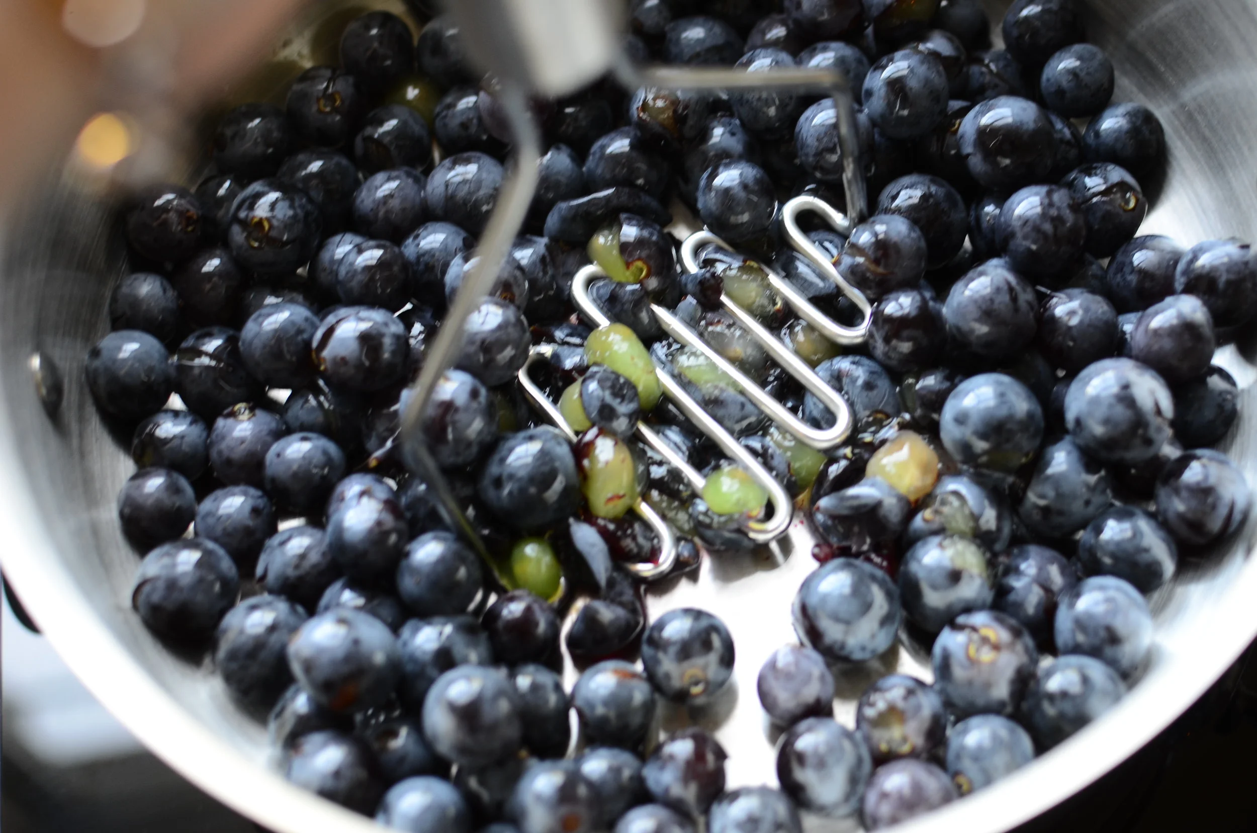 Place the grapes in a large casserole pan or deep skillet and use a potato masher to squash them really well. Did you know the inside of those dark purple grapes were light green?