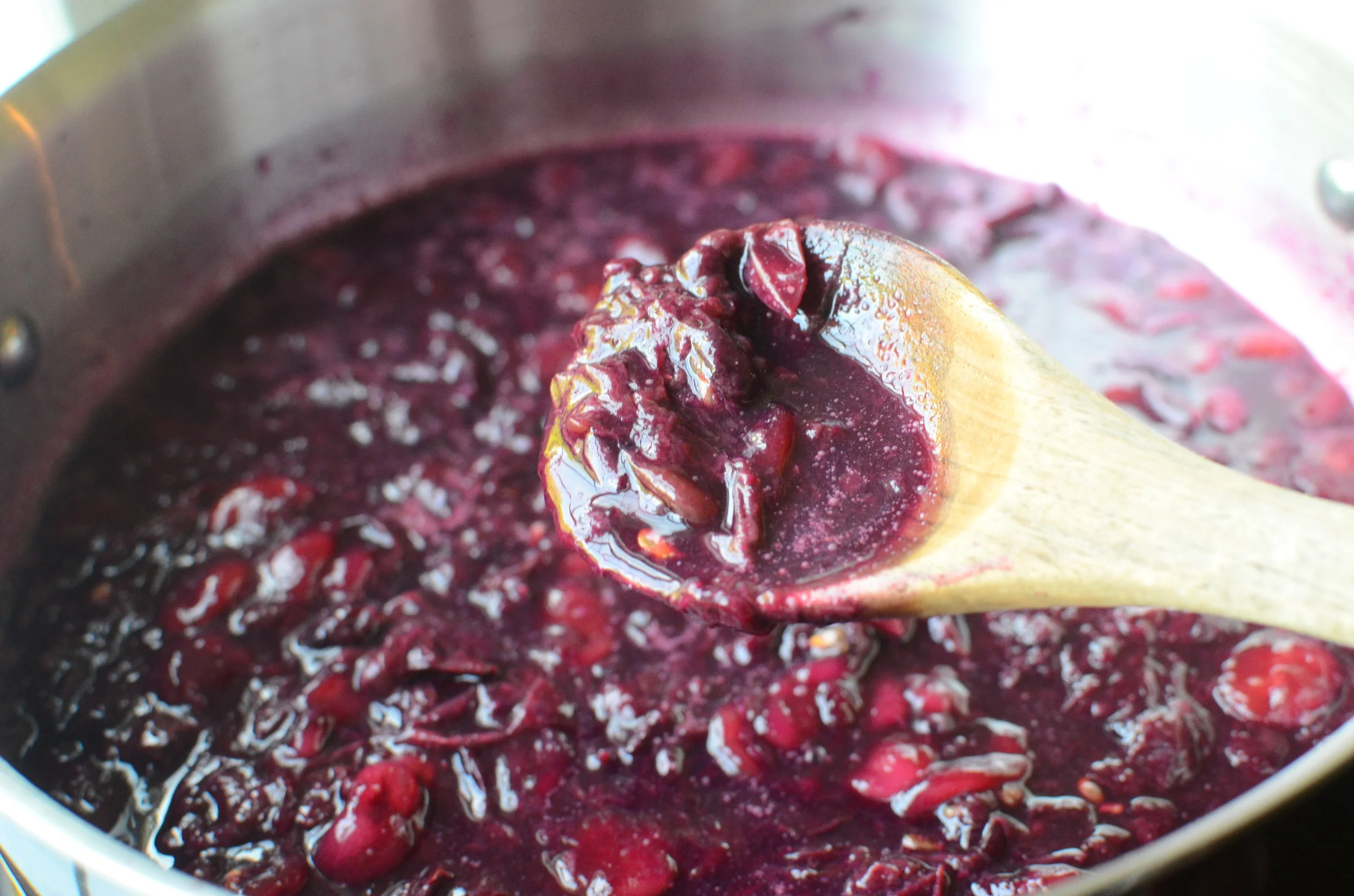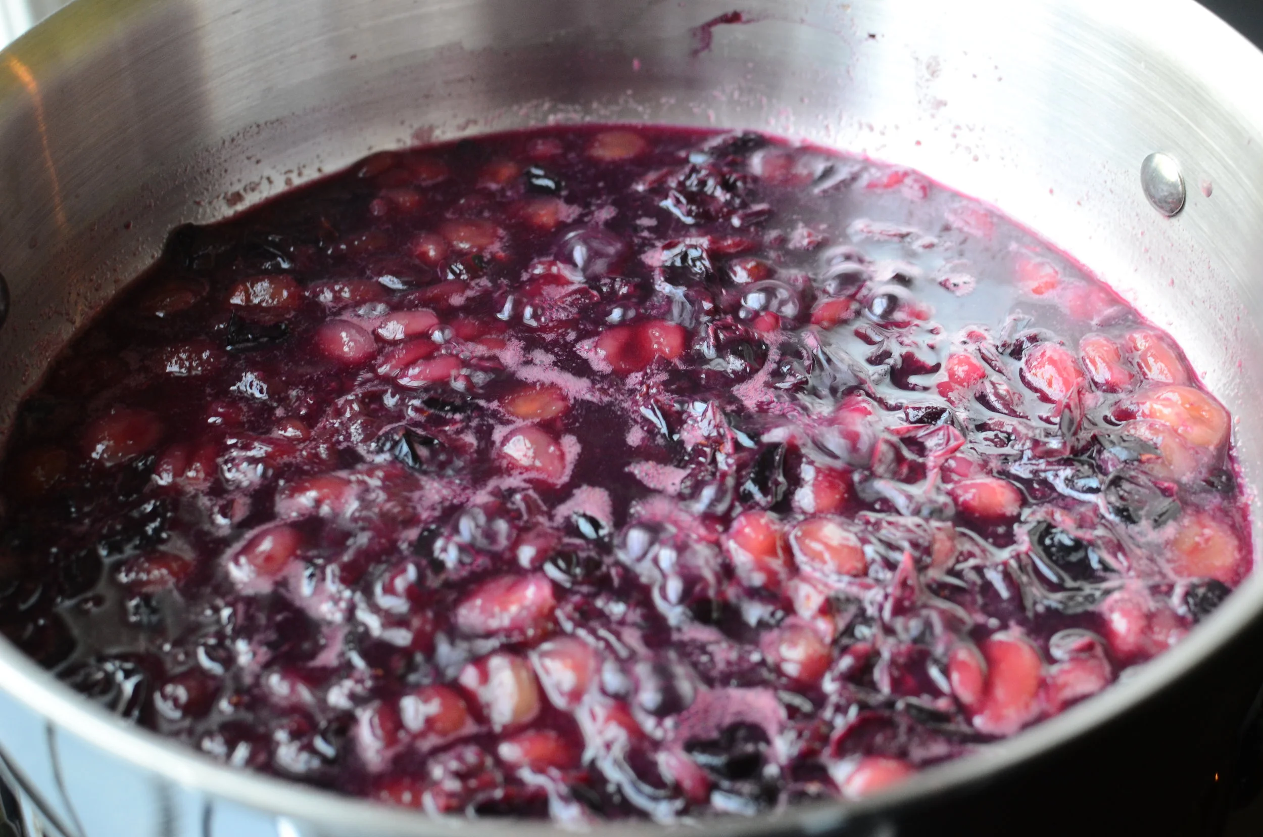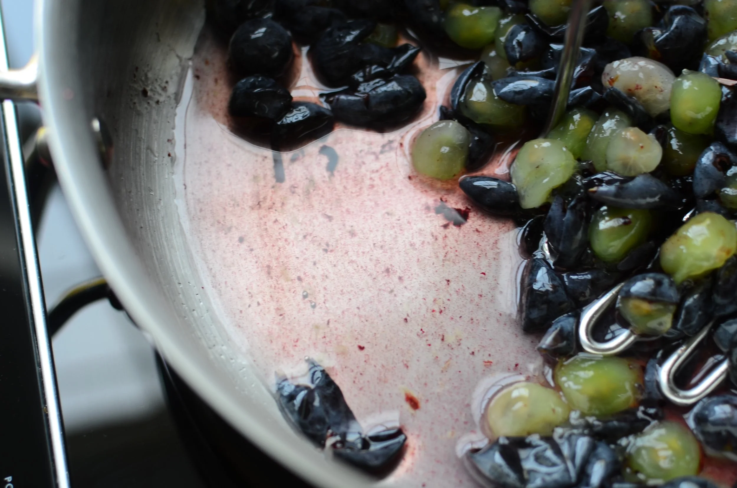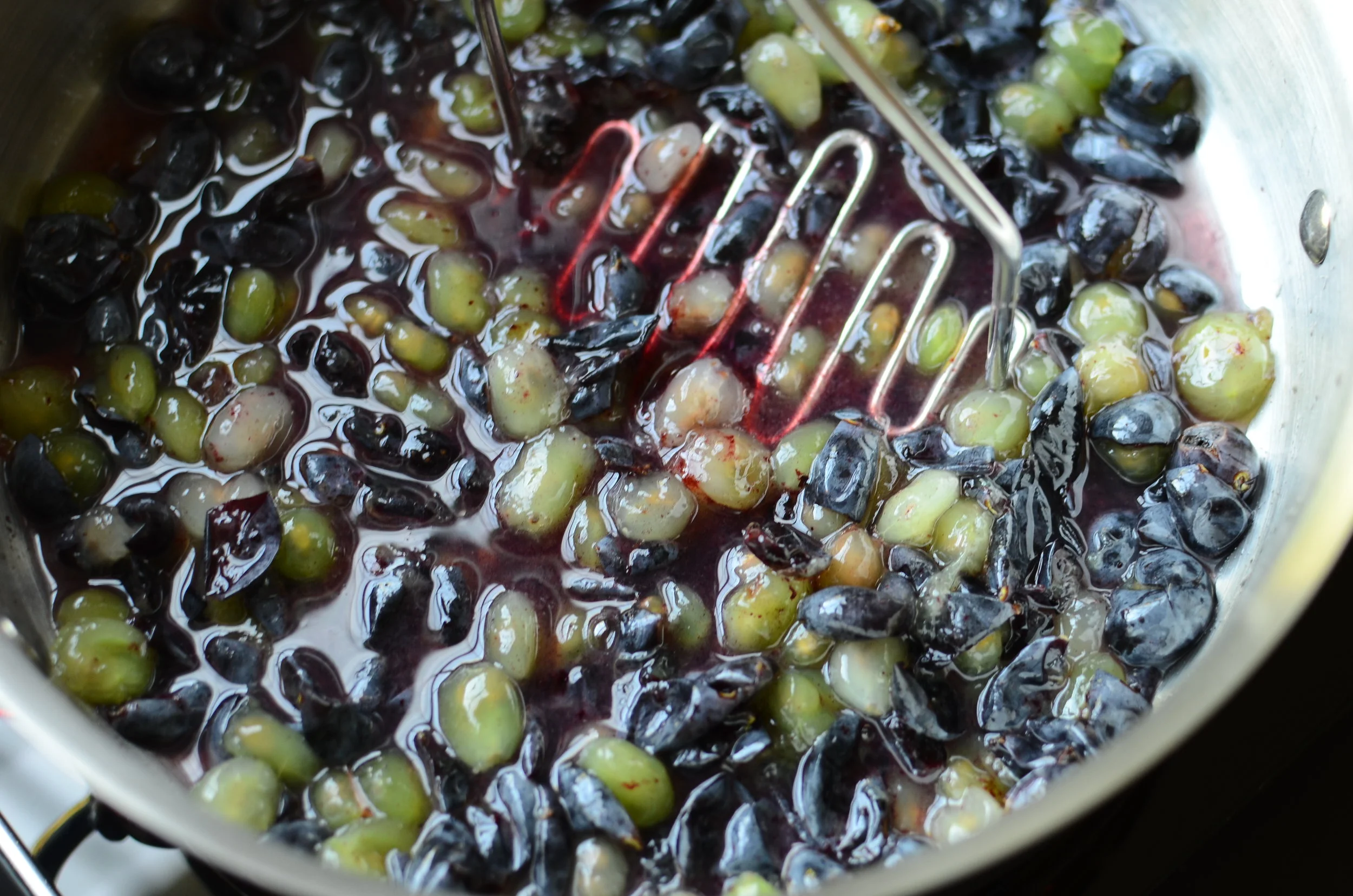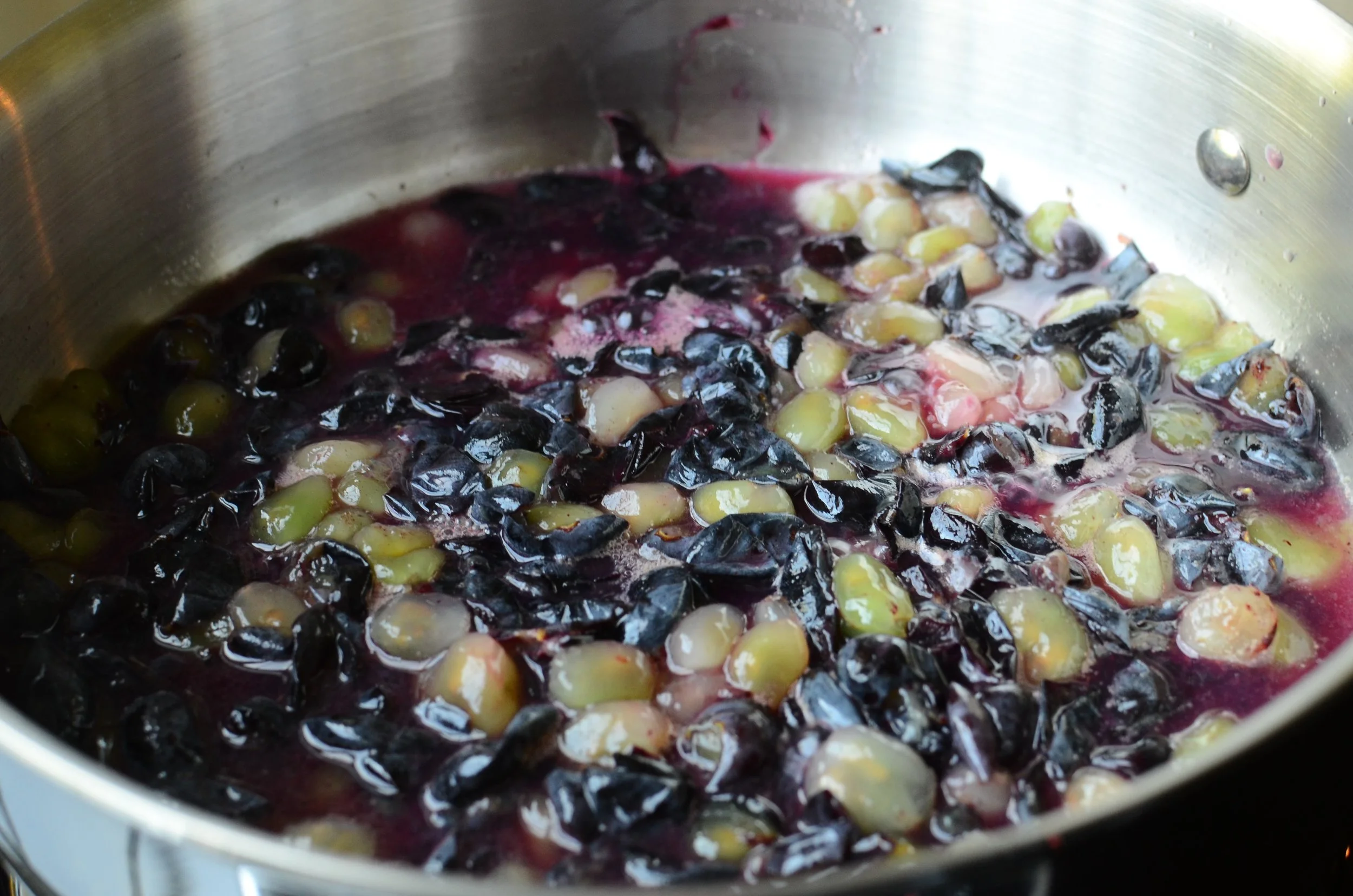 - Simmer over medium heat, mashing occasionally until the grapes break down as shown above.